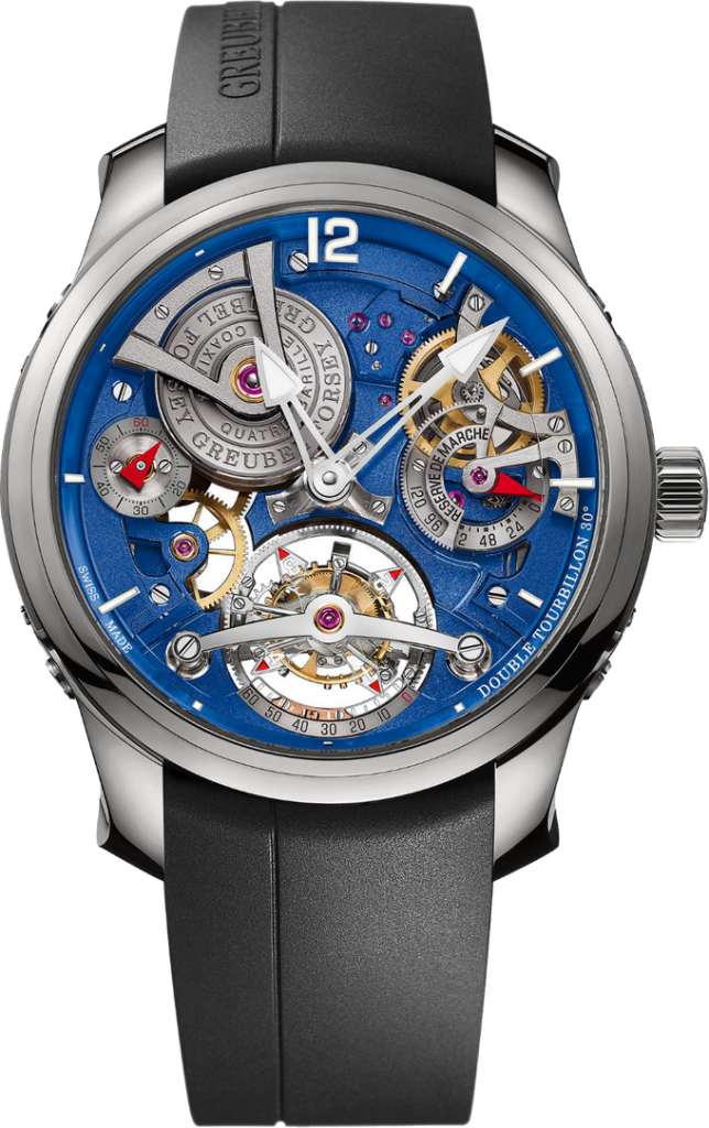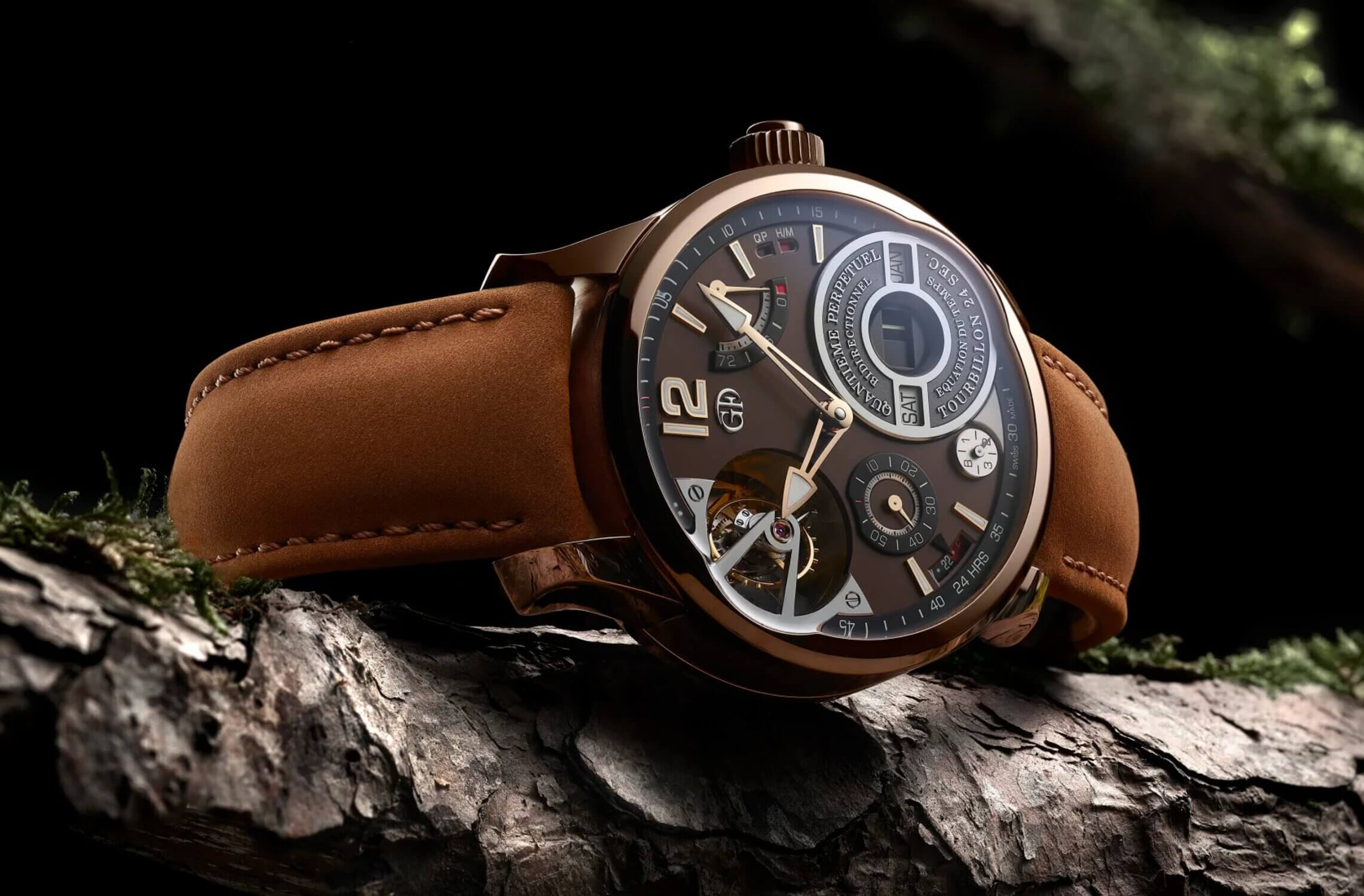 This Armin Strom exquisite 41mm 18K pink gold watch features day and month indication combined with moon phase at 6 o’clock, making it very easy to tell the time. Depicting two gold moons and a star-studded sky, which only needs adjusting every 122 years.
